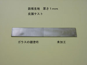 ・厚さ1ミリの鉄板を研磨し、その半分にガラスの鎧を塗布。残り半分は未加工。