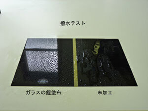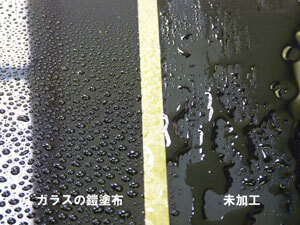 結果:未加工部分はベタッとしたはじき方だが、ガラスの鎧を塗布した部分は水玉になる。