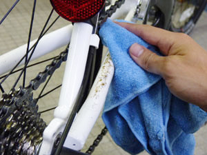 ・実際にガラスの鎧を施工した自転車のチェーンステーを水拭きしてみる。(今回汚れが物足りなかったので人為的に自動車の廃油も付着させてみました。)
