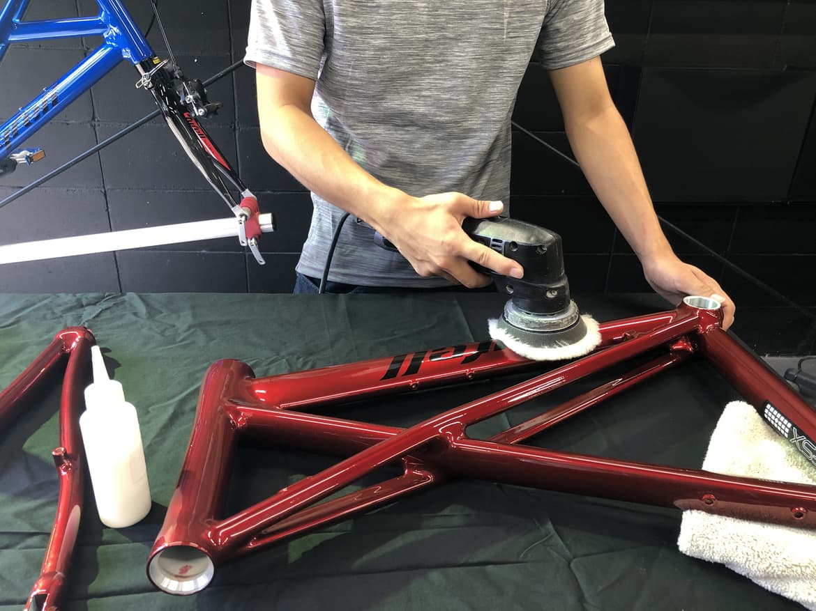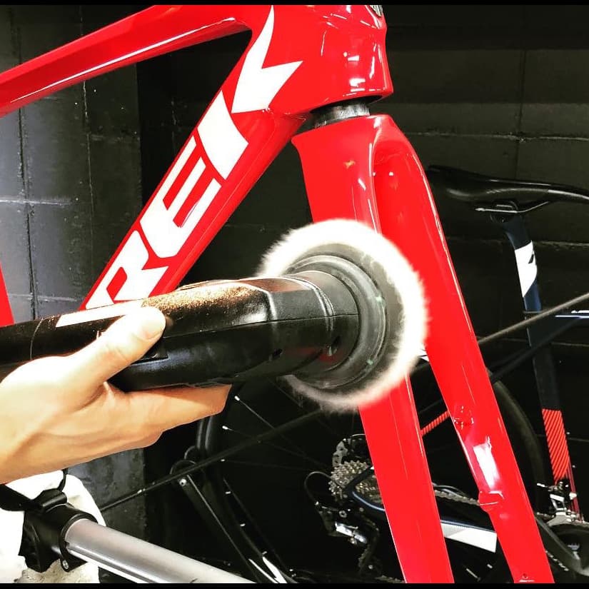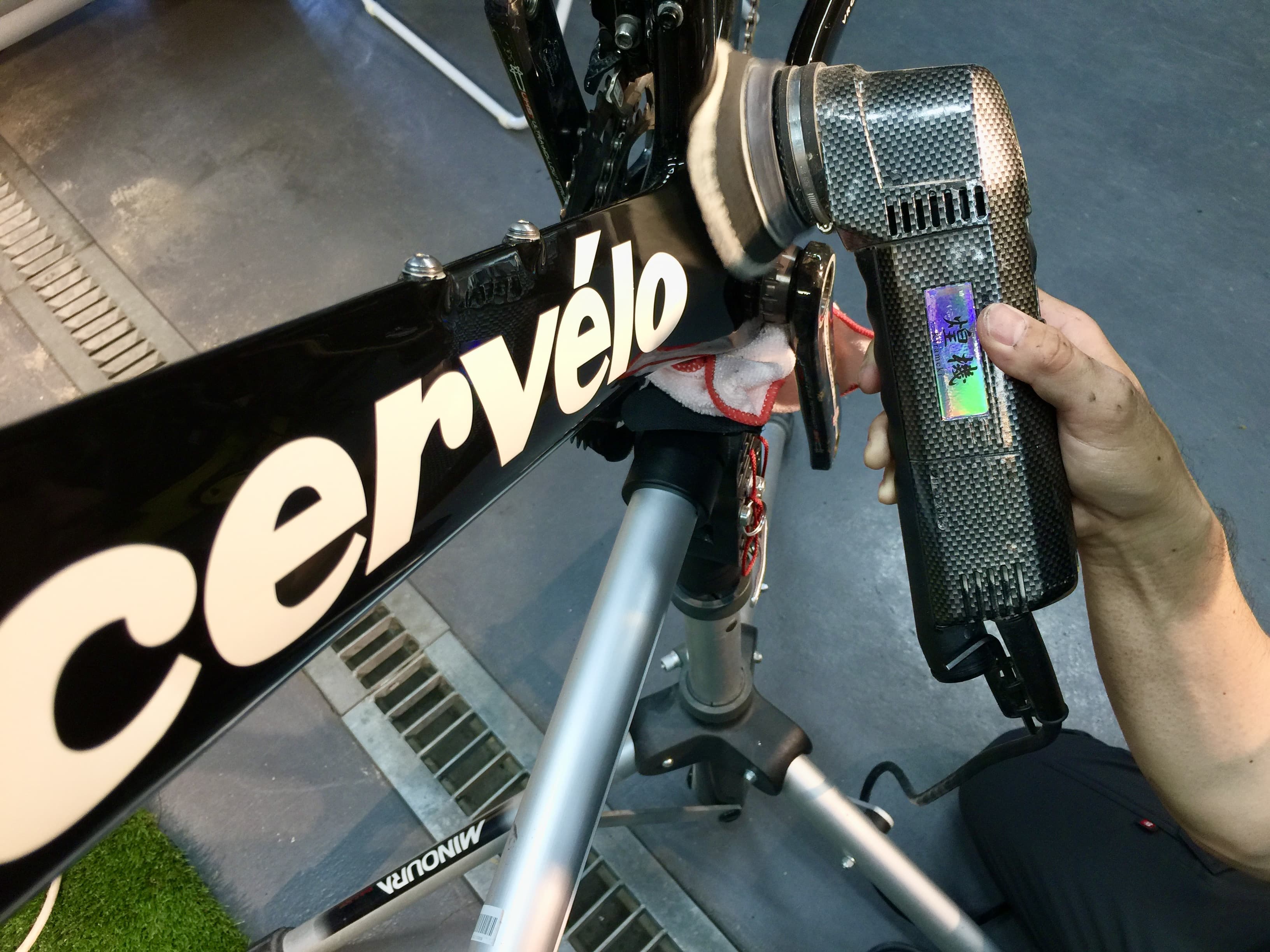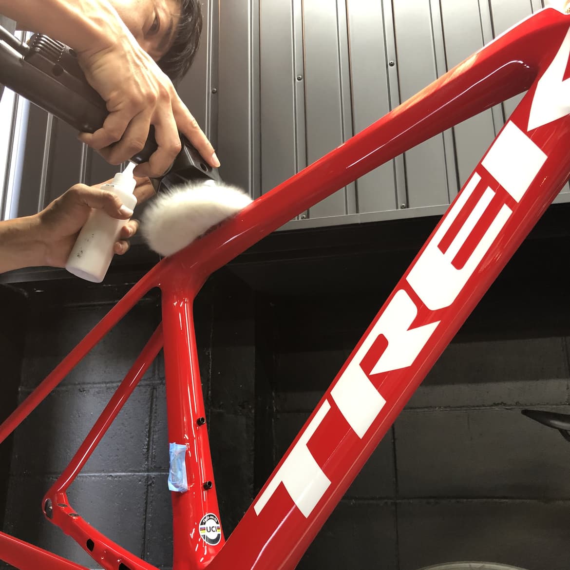 弊社は2010年に自転車業界初の硬化系ガラスコーティング「ガラスの鎧」を発売し、それに伴い自転車をいかに綺麗にするかに取り組んできました。とりわけフレームの鏡面研磨技術については100店舗以上のショップ様に技術研修をさせて頂きました。