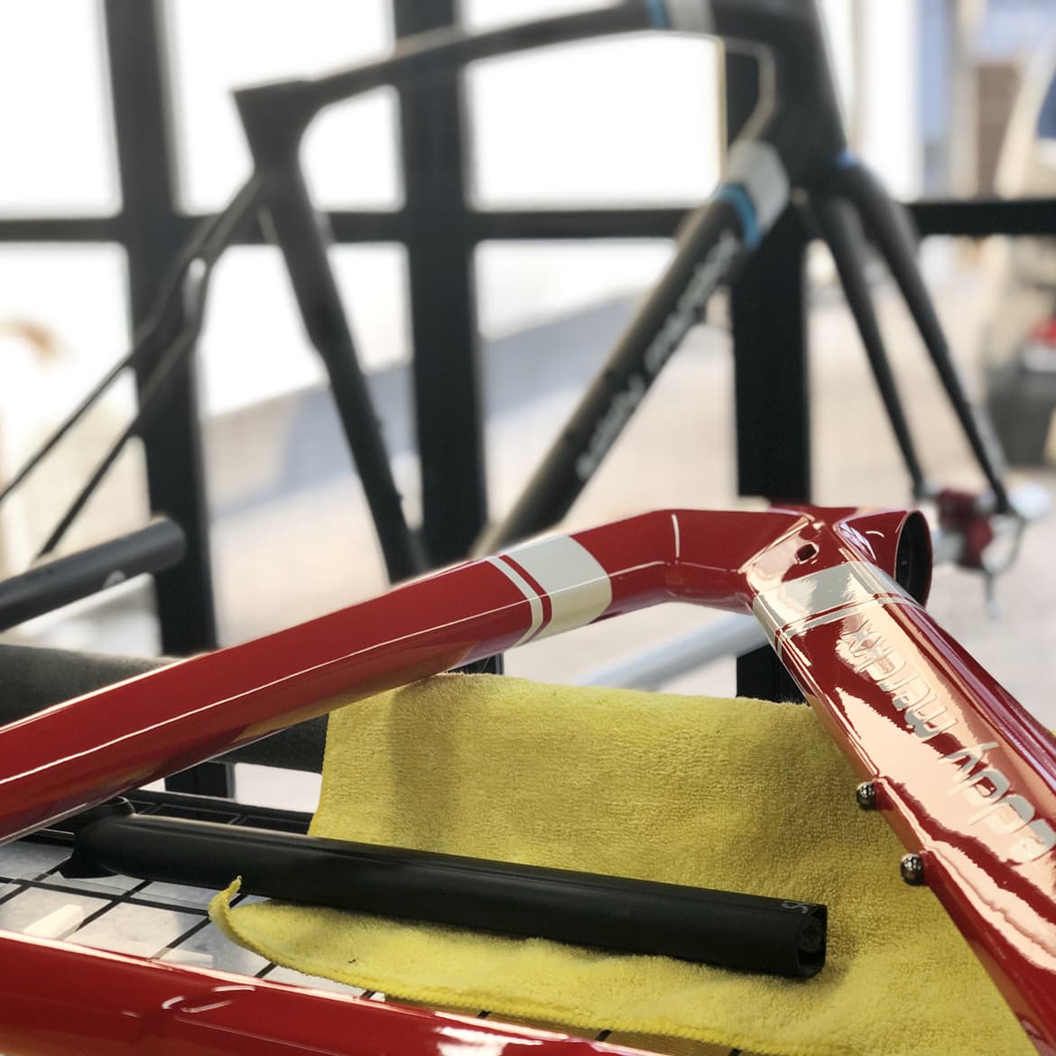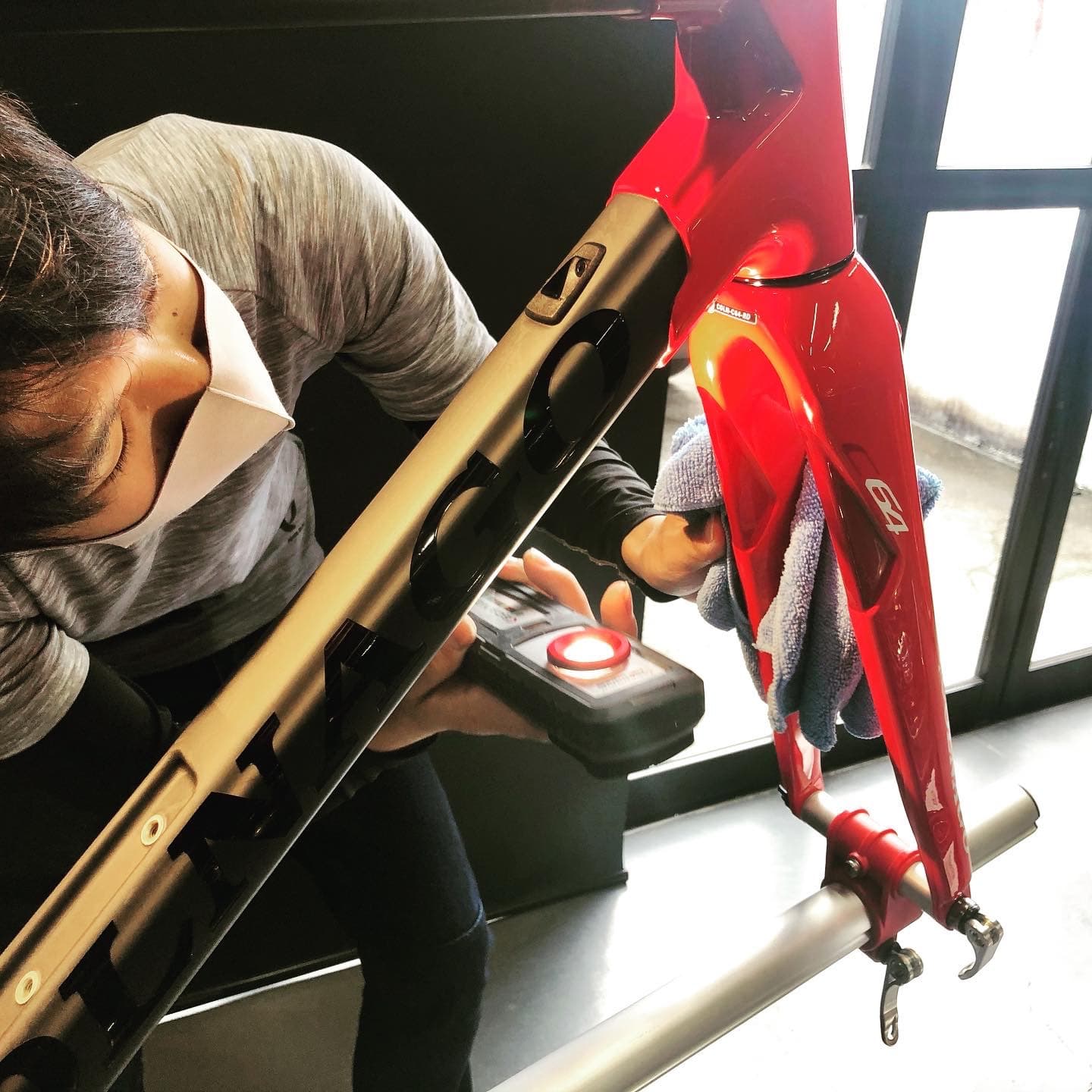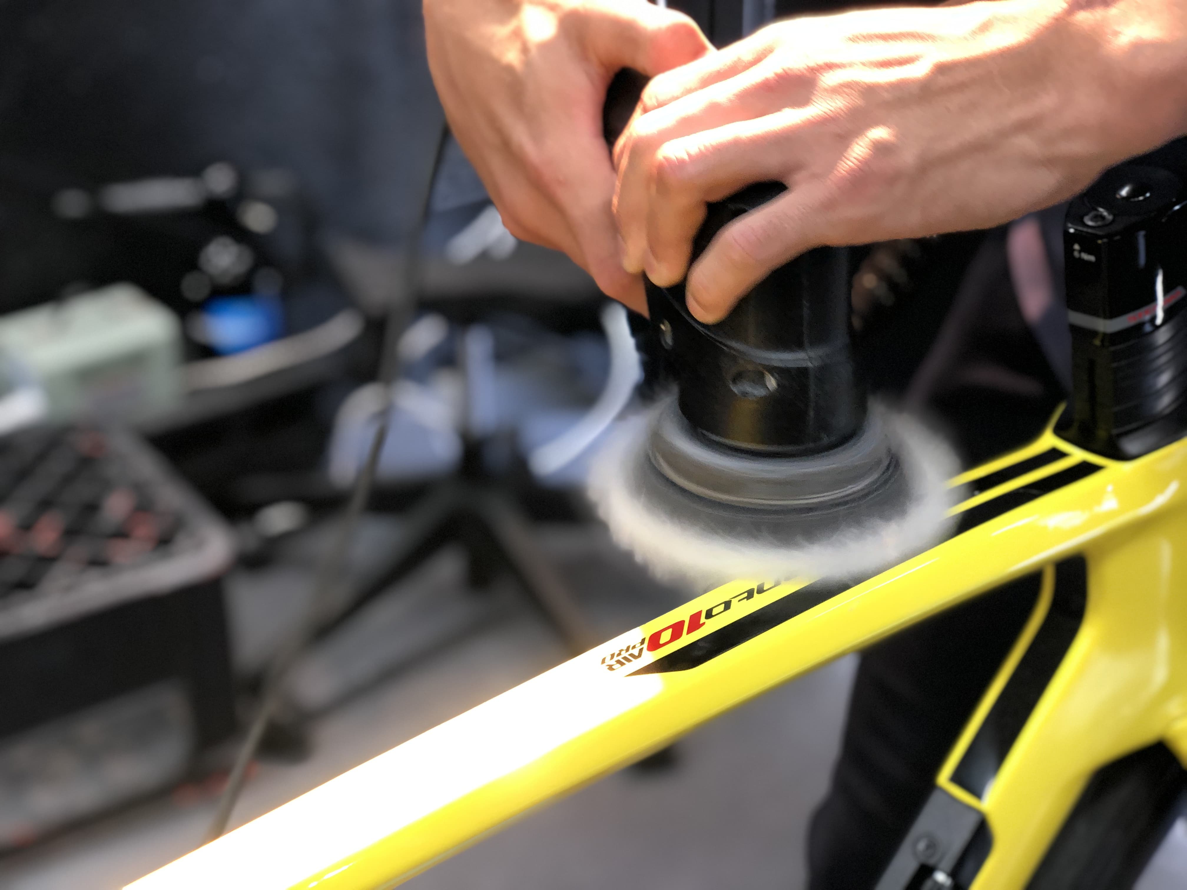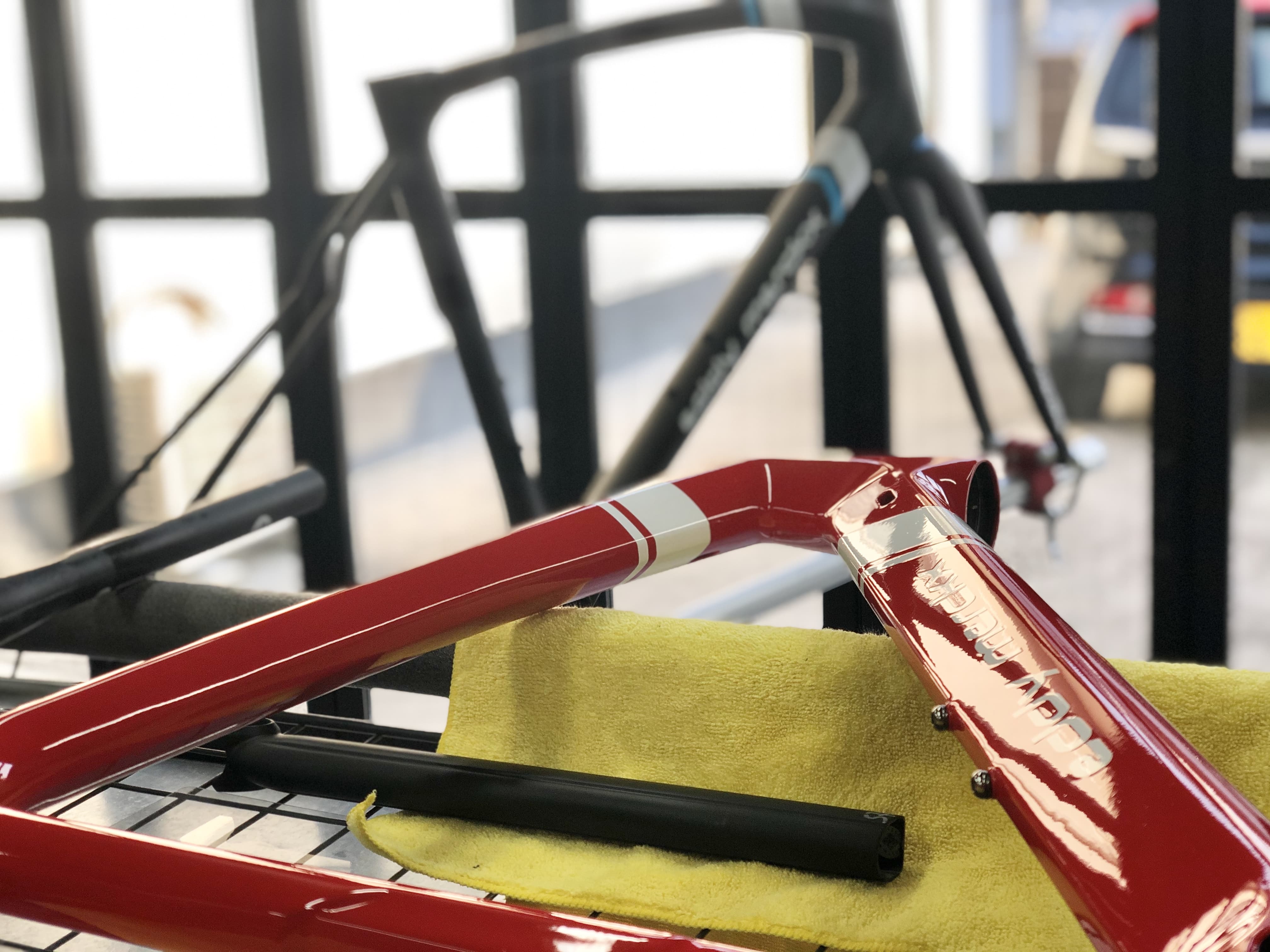 弊社は2010年に自転車業界初の硬化系ガラスコーティング「ガラスの鎧」を発売し、それに伴い自転車をいかに綺麗にするかに取り組んできました。とりわけフレームの鏡面研磨技術については100店舗以上のショップ様に技術研修をさせて頂きました。